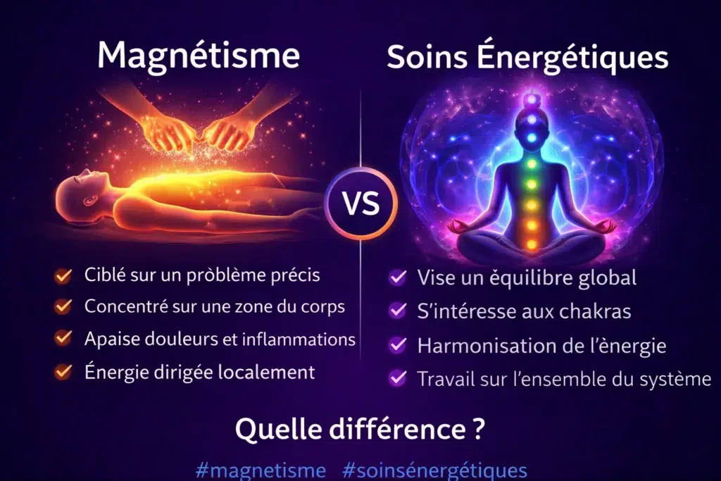 Le magnétisme agit souvent de façon ciblée pour soulager une zone précise, tandis que les soins énergétiques travaillent davantage sur l’équilibre global du système énergétique.